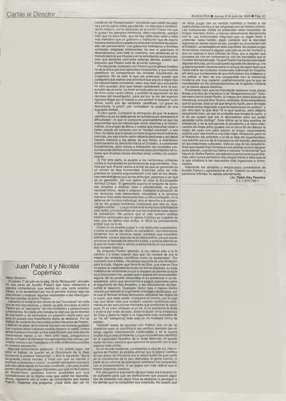 Juan Pablo II y Nicolás Copérnico [respuesta de Pablo Ney Ferreira a Aurelio Pastori]